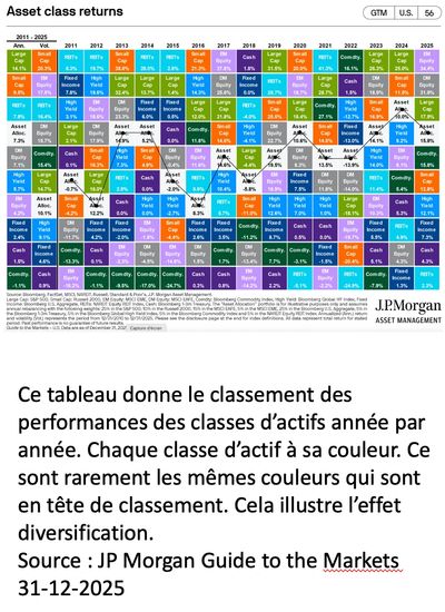 1/ La diversification entre de multiples classes d'actifs peu corrélées entre elles permet d'améliorer le couple rendement/risque de l'ensemble du portefeuille. Par l'exemple avoir une exposition structurelle à l'or, aux matières premières, à l'immobilier, aux obligations des pays émergents, etc.
